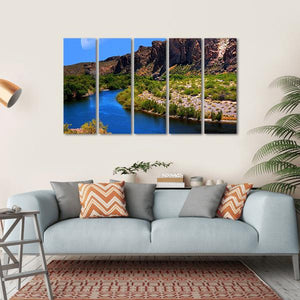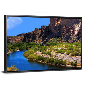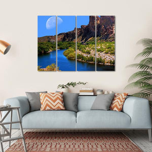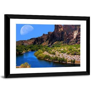 Embrace the serene beauty of a river landscape under a large crescent moon. This artwork captures majestic mountains and lush vegetation, creating a peaceful atmosphere perfect for any space.