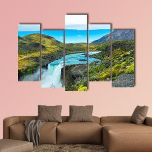 Salto Grande waterfall in Chile captured in a photorealistic canvas print, featuring a bright blue river, lush green hills and distant mountains under a blue sky. The rule-of-thirds composition and depth create a serene, majestic mood that suits modern or nature-inspired rooms.