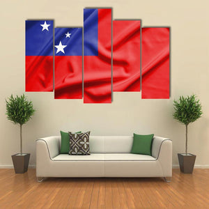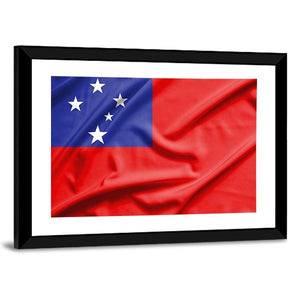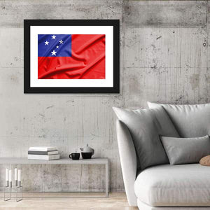 Samoan national flag rendered on canvas with a flowing silk texture, giving the image a bold, clean, patriotic presence. The symmetrical composition and modern treatment suit contemporary home wall decor. The red, blue, and white palette reads graphic and direct.