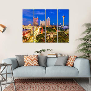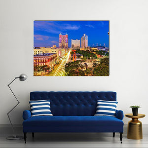 This canvas art captures the vibrant skyline of San Antonio, showcasing tall buildings illuminated against a backdrop of energetic colors. Perfect for adding a touch of urban flair to any room.