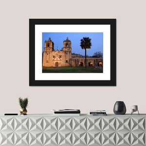 A realistic landscape of the San Antonio Missions, depicting the mission and church with palm trees, twin bell towers and arched doorways under a dusk sky. Its calm, historic mood and stone, blue, brown and green palette suit a living room or hallway and pair well with modern decor.