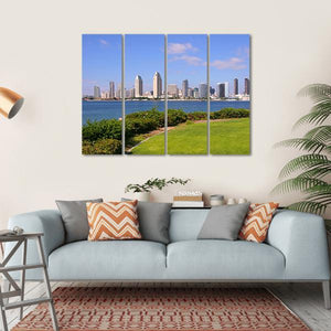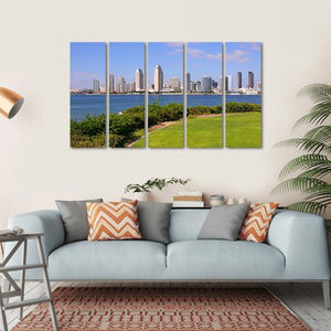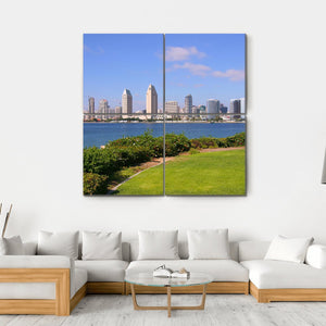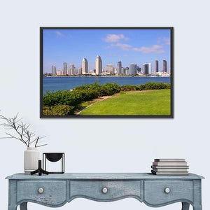 This canvas art captures the serene beauty of the San Diego skyline, showcasing tall buildings against a bright sky. The calming palette of blue, green, and white evokes a peaceful urban atmosphere, making it a great addition to any room decor.