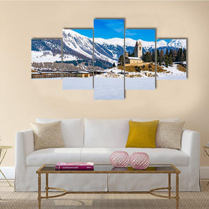 San Gian Church in Switzerland sits before snowy mountain peaks in a realistic winter landscape, the church steeple lending a serene, majestic presence. Rendered in cool blues and whites with touches of brown and green, this canvas print uses depth and rule-of-thirds composition to add a peaceful, nature-focused accent to modern home wall decor.