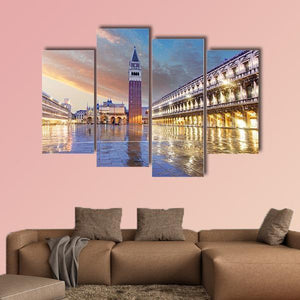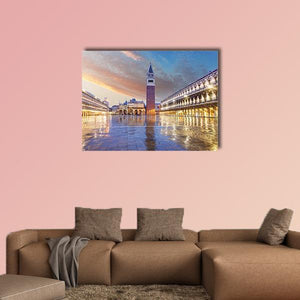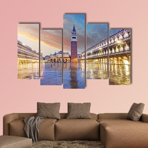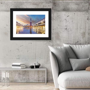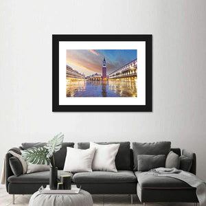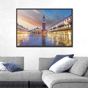 This photographic cityscape shows St. Mark's Campanile and Piazza San Marco in Venice at dusk, with wet paving stones reflecting the square's lights. Rendered in blues, oranges and warm browns, the realistic print feels serene, majestic and quietly historic — a calm focal point for living rooms or travel-inspired spaces.