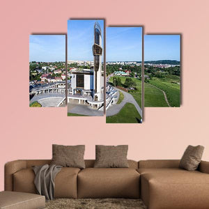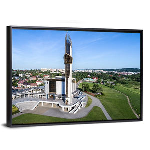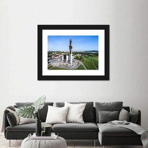 This canvas shows a modern building and cityscape set in a green landscape, with a tall spire-like structure and curved walkways seen from an aerial, wide viewpoint. The blue, green and white palette and open, modern mood work well in contemporary living rooms, offices, or entryways looking for calm, airy wall decor.