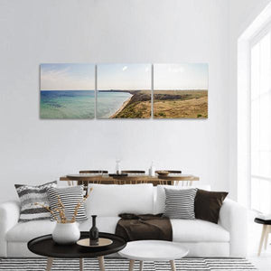 A panoramic view of a sandy coastline with calm turquoise water, grassy cliffs, and a light sky with wispy clouds. The scene feels serene and vast, rendered in a modern, naturalistic style. Fits coastal or contemporary rooms that favor relaxed, nature-inspired decor.