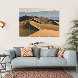 This captivating canvas artwork features serene sand dunes under a beautiful sunrise sky. The layered mountains in the background complement the natural palette of tan, brown, and blue, creating a vast and peaceful atmosphere perfect for enhancing any space.