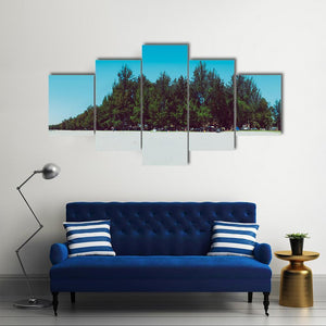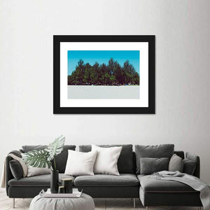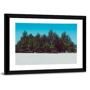 Sand Dunes With Trees And Sepang Beach shows a line of pine trees along a sandy beach beneath blue, green, and white skies. The composition follows the rule of thirds for a calm, natural feeling. It suits coastal or modern interiors as relaxed room decor.