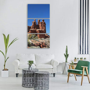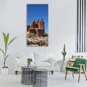 Sandstone Rock In Utah Desert captures three sandstone spires rising from scrubby desert vegetation beneath a clear blue sky. The scene reads as majestic and arid, with warm reds and browns grounded by green and blue accents. It suits rustic or nature-inspired rooms and modern living spaces seeking a grounded focal piece.