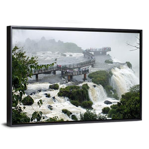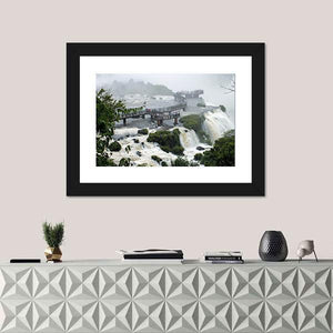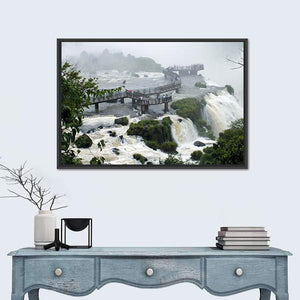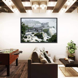 Santa Maria Falls in Brazil is shown from an eye-level boardwalk, with a powerful waterfall cascading over rocks, mist rising, and dense green vegetation. The realistic nature-photography style and palette of greens, whites, grays, and browns create a majestic, serene mood that suits modern living rooms and nature-themed spaces.