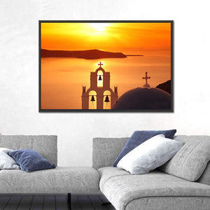 This stunning canvas artwork captures the serene beauty of a sunset over Santorini, featuring the iconic blue dome and white bell tower of Firostefani Church. The warm palette of orange, yellow, and blue evokes a vibrant atmosphere that enhances any space.