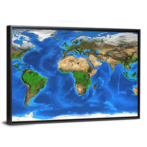 This canvas art features a stunning satellite view of Earth, showcasing the world map with continents and oceans in a realistic style. The topographic details highlight elevation and bathymetry, creating an educational and geographic vibe.