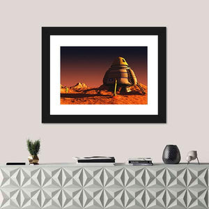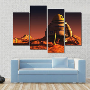 This captivating canvas wall art features an astronaut exploring a rocky, barren landscape on Mars, set against an otherworldly night sky. The use of orange and brown tones, along with distant mountains, creates a sense of adventure and exploration.