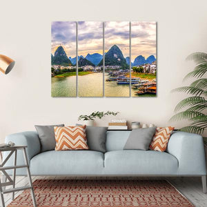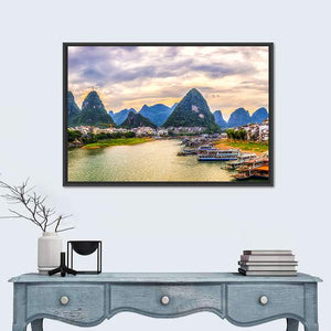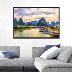 Experience the serene beauty of Guilin with this canvas wall art featuring majestic karst mountains, a peaceful river, and charming boats along the shore. The vibrant palette of greens, blues, and yellows captures a tranquil sunset scene, perfect for enhancing any living space.