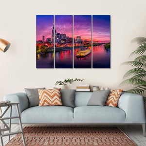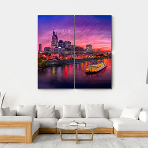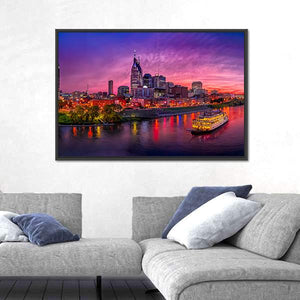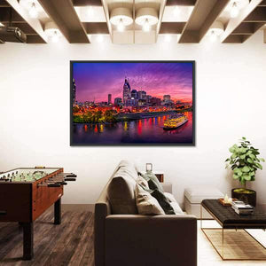 This vibrant canvas art features a beautiful view of the Nashville skyline framed by a serene river, highlighting a charming riverboat. The warm palette of purple, pink, orange, blue, and yellow creates a romantic atmosphere perfect for any room.