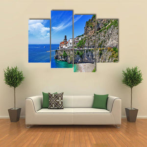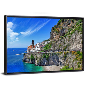 This serene canvas art captures a coastal town along the Amalfi Coast, showcasing buildings perched on cliffs against clear blue water. Its photorealistic style and calming palette of blue, green, and white make it an ideal addition to any space.