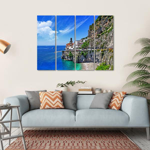 Bring the picturesque beauty of Italy's Amalfi Coast into your space with this captivating canvas print. Featuring charming cliffside buildings and a serene beach below, this artwork captures the essence of a sunny day by the clear blue ocean.