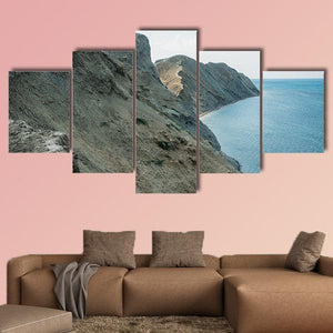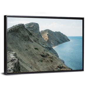 A realistic seascape featuring coastal cliffs, clear blue water and a sandy cove beneath the Crimean Mountains ridge. Layered rock formations and an open horizon give the scene a serene, majestic, and vast atmosphere that works well in modern or coastal-themed rooms.