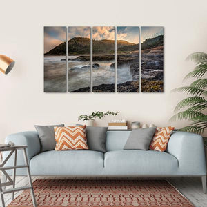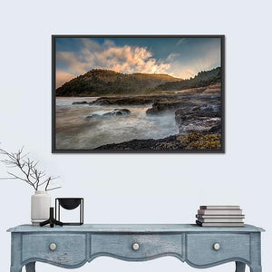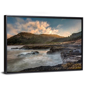 This canvas art captures the tranquil beauty of Cape Perpetua's coastline, showcasing the ocean, rocks, and sunlight breaking through clouds. The serene palette of blues, oranges, and browns evokes a dramatic natural atmosphere, making it a lovely addition to any space.