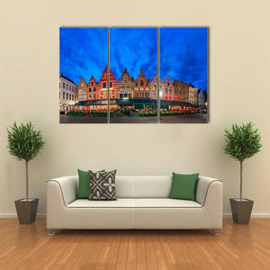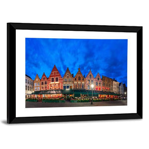 A realistic, wide-angle cityscape of a medieval fairytale town at night, showing a row of historic buildings, a cobblestone square, and restaurants with outdoor seating. Glowing windows and streetlights create a vibrant, bustling evening atmosphere in blues, reds, yellows, greens, and whites, and the print works well in living rooms or dining areas.