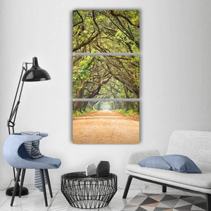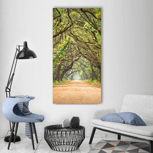 A quiet dirt road winds under oak trees draped in Spanish moss on Edisto Island, capturing a peaceful forest tunnel. Light filters through the leafy canopy, giving the scene a serene, inviting mood. Suits rustic or naturalistic decor where a calm, nature-focused piece is wanted.