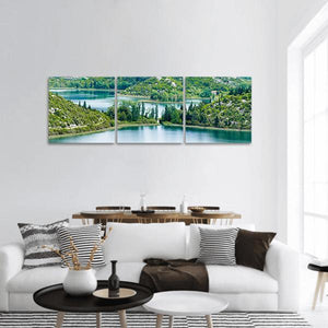 A realistic panoramic view of a lake in Croatia, with trees, hills and rocky outcroppings rendered in greens, blues and whites. The scene feels serene and natural and suits modern or nature-inspired interiors looking for calm, landscape artwork.
