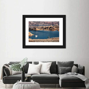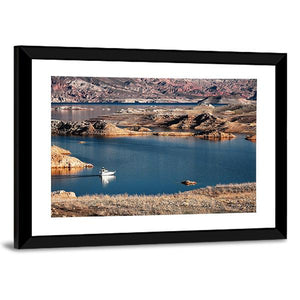 Capture the serene beauty of Lake Mead with this canvas wall art. A small white boat glides across the calm water, framed by rocky shores and distant mountains. This piece brings a tranquil, natural vibe to any space.