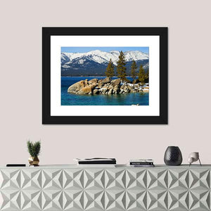 This canvas art captures the serene beauty of Lake Tahoe in winter, featuring snow-capped mountains, a tranquil lake, and pine trees. Its rustic style and soothing palette of blue and white invite a calming atmosphere, perfect for enhancing any nature-inspired décor.