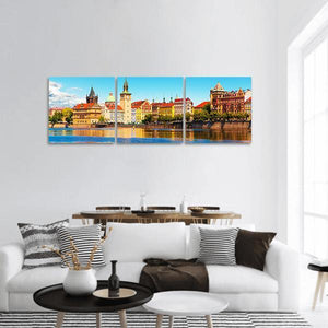 A panoramic canvas of Prague's Old Town, showing the skyline and the Vltava River in a vibrant, historic summer light. Realistic details emphasize Gothic and Baroque architecture and the reflective water, with a palette of blue, yellow, orange, brown, and white. Fits well in modern or classic interiors as a picturesque room focal point.