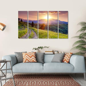 This canvas art features a serene mountain landscape at sunset, highlighting a dirt road that meanders through rolling hills. The warm palette of green, yellow, blue, and purple evokes a peaceful atmosphere perfect for any room.