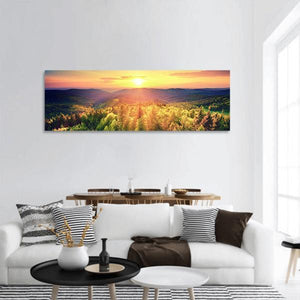 A panoramic canvas depicting forested hills and layered mountains at sunset, with sunbeams forming a clear sunburst across the scene. The photorealistic, vibrant colors — yellows, greens, blues, oranges and purples — create a peaceful, majestic mood. Suits modern or nature-inspired rooms as a calm focal piece.