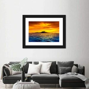 This panoramic canvas art captures a serene view of an island at sunset, showcasing a calm ocean with a stunning palette of orange, yellow, and blue. The photorealistic depiction features rippling water and distant mountain silhouettes, creating a warm and peaceful atmosphere for any space.