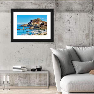 A realistic coastal landscape showing a sunny view of Castelsardo village, with a stone tower, castle and many sailboats in the harbor. The blue, brown, white and orange palette gives a peaceful, scenic feel. Suits coastal or modern room decor and nature-themed spaces.