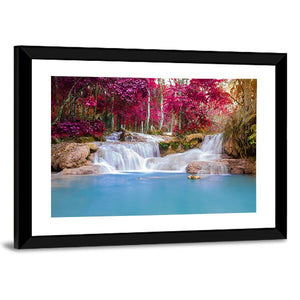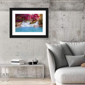 This canvas features a vibrant waterfall amidst lush pink trees and a tranquil forest pool. The serene blues and pinks create a calming atmosphere, perfect for bringing nature's beauty indoors.