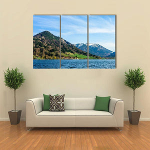 Schliersee Lake in Bavaria is rendered as a realistic landscape with a clear blue sky, snow-capped peaks, and houses nestled on a green slope. The calm lake, trees, and rule-of-thirds composition create a serene, picturesque scene that works well in modern or nature-inspired rooms.