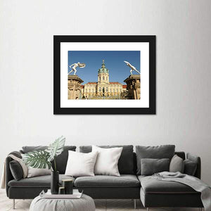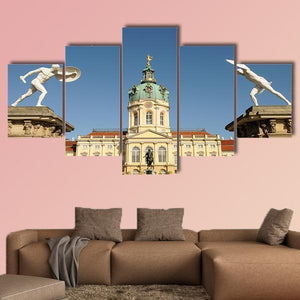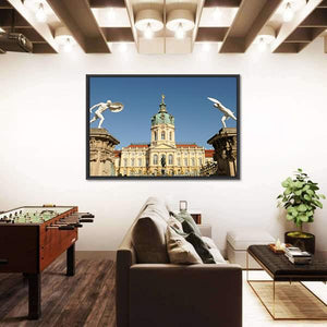 This canvas depicts Schloss Charlottenburg Palace in a balanced, symmetrical cityscape with its dome-topped building, guardian statues, and ornate gate. A palette of blue, gold, white and yellow creates a grand, serene mood that fits classical interiors and formal living spaces.