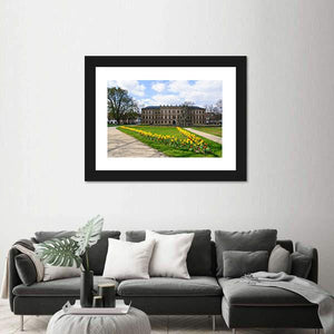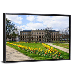 Experience the serene beauty of spring with this canvas art featuring a charming German garden. The piece showcases vibrant rows of yellow and red tulips alongside a majestic building, surrounded by sparse trees under a partly cloudy sky. It makes a cheerful addition to any room décor.
