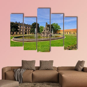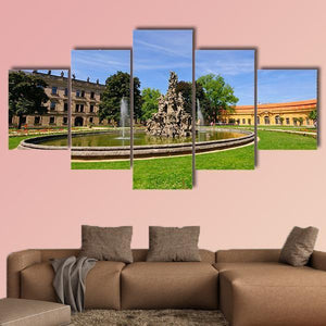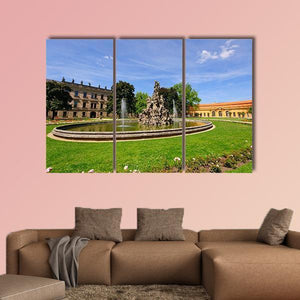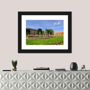 Schlossgarten in Erlangen, Germany shows a peaceful summer garden scene with an ornate fountain, classical building, and sunlit lawn. The realistic composition uses greens, blues, browns and touches of yellow and follows a rule-of-thirds layout for a balanced, scenic feel. A calm, natural focal piece for room decor that favors soothing color palettes.