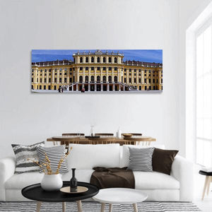 Schonbrunn Palace in Vienna, Austria is captured in a panoramic canvas print that highlights the ornate yellow facade, white columns, and sculptural figures on the roof. Its symmetrical, classical composition and bright blue sky create a grand, historic mood that suits living rooms, entryways, or spaces with architectural decor.