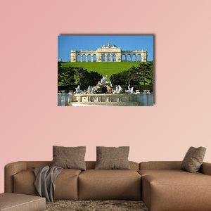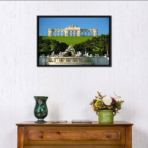 This canvas print depicts Schonbrunn Park in Vienna with the palace, Neptune fountain, and formal gardens framed by trees. The symmetrical composition and green‑and‑blue palette create a grand, elegant, and serene atmosphere that works well in classical or modern interiors like living rooms and hallways.