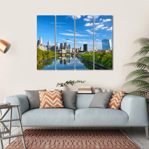 This vibrant cityscape captures the serene beauty of the Schuylkill River and its skyline. Featuring a wide-angle view with reflections of urban buildings and a clear sky, this artwork brings an energetic touch to your space.