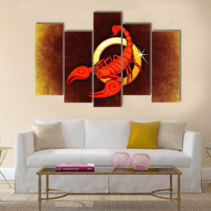 Centered on the canvas, a stylized scorpion zodiac sign stands beneath a yellow crescent with constellation accents in warm orange, yellow, and brown. The illustration reads mysterious and bold, with a sparkle effect that underscores its astrological mood. Suited to modern or astrology-focused rooms as a focused wall decor piece.
