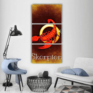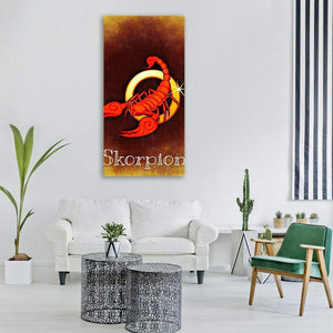 Centered on a stylized scorpion and zodiac symbol with the text "Skorpion," this canvas uses a bold, mystical palette of red, orange, yellow, brown, and white. Its graphic, modern look suits astrology-themed or contemporary rooms as distinctive wall decor.