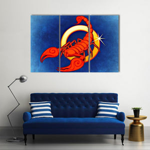 Centered on a stylized scorpion graphic with the word "Scorpio", this canvas uses bold blue, orange, yellow, and white tones for a mystical, astrological look. The modern, graphic design suits contemporary or astrology-themed rooms and works as a strong focal piece in wall decor.