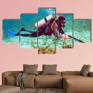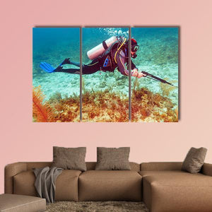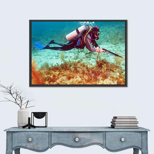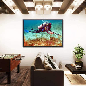 A scuba diver hovers above a coral reef in a realistic underwater scene, with scuba gear, a speargun and a small orange sea creature giving the image an adventurous yet focused feel. Blues, browns, blacks and touches of yellow bring a serene, nature-inspired accent that fits modern home décor and room decor.