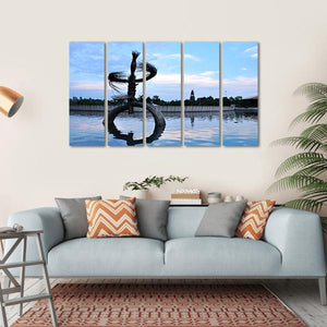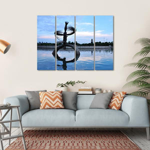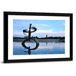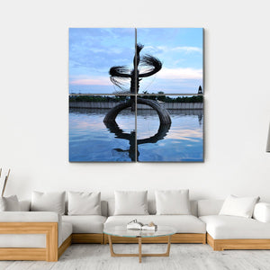 This abstract canvas art features a serene wire sculpture reflected in water, surrounded by a calming palette of blue, gray, and white. Perfect for those looking to add a modern touch to their living space.