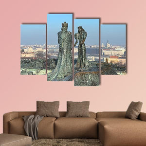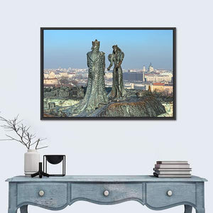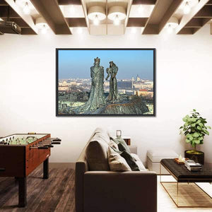 Bronze statues of Prince Buda and Princess Pest stand side-by-side with detailed robes against a city skyline that includes a domed building. The eye-level composition, slight depth, and a palette of bronze, blue, grey, and white give the scene a regal, historic, panoramic feel. Works well as a focal canvas in modern or classic living rooms and studies.
