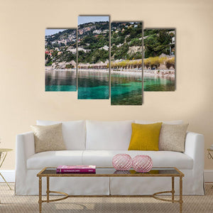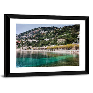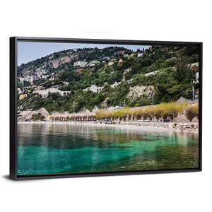 A realistic landscape of the French Riviera, showing a coastal town tucked into cliffs beside clear turquoise water and trees lining the shore. The wide-angle scene feels serene and picturesque, offering a calm, coastal mood that suits living rooms and seaside-themed spaces.