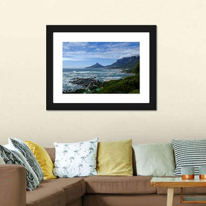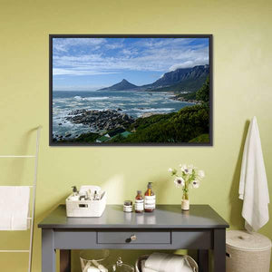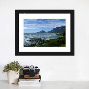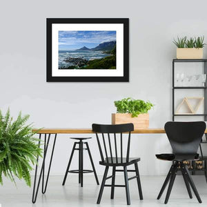 This landscape captures the serene beauty of the ocean, mountains, and coastline of Cape Town. The artwork features a calm sea under a sky filled with clouds, while small buildings with green roofs peek near the shoreline, evoking a natural and vast atmosphere.