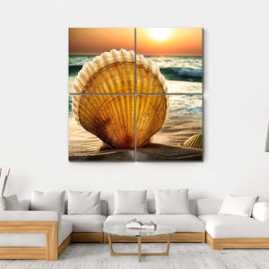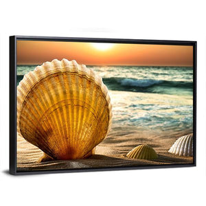 This art piece beautifully captures seashells on a tranquil beach at sunset. With warm tones of orange, blue, and tan, it brings a serene atmosphere to any space, perfect for nature lovers.
